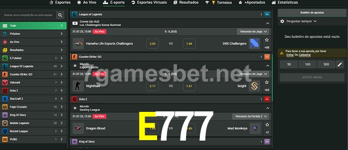 A aposta E777 oferece aos jogadores a experiência mais conveniente de apostas em eSports!